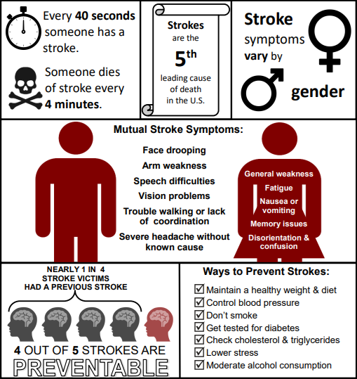 Stokes are caused when something disrupts blood flow to part of the brain or a blood vessel in the brain ruptures. This may cause parts of the brain to become damaged or die, cause long-term disability, or in some cases, death. Despite 80% of strokes being preventable, strokes are the 5th leading cause of death in the U.S. Knowing the symptoms of a stroke, as well as the many ways strokes may be prevented, may help save yourself or someone else.